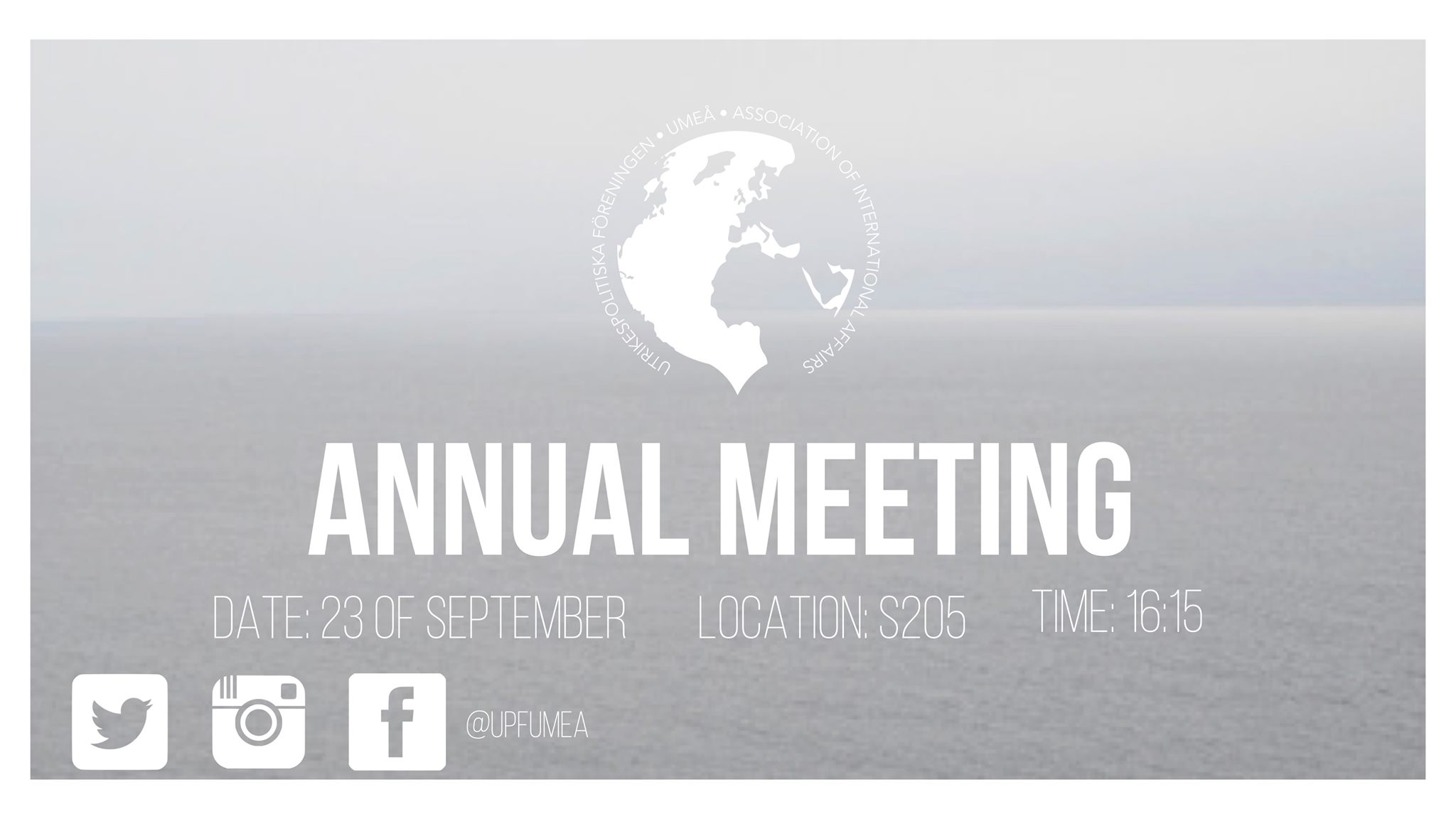 Dear members of UMEÅ Association of International Affairs,You are hereby summoned to Umeå Association of International Affairs annual meeting of 2020. The meeting will be held in samhällsvetarhuset in Hörsal S205 at 16:15. Because of the current pandemic the meeting will only allow a physical attendance of 50 people. If the attendance should exceed 50 people a zoom-link will be provided for the rest of the attendees.